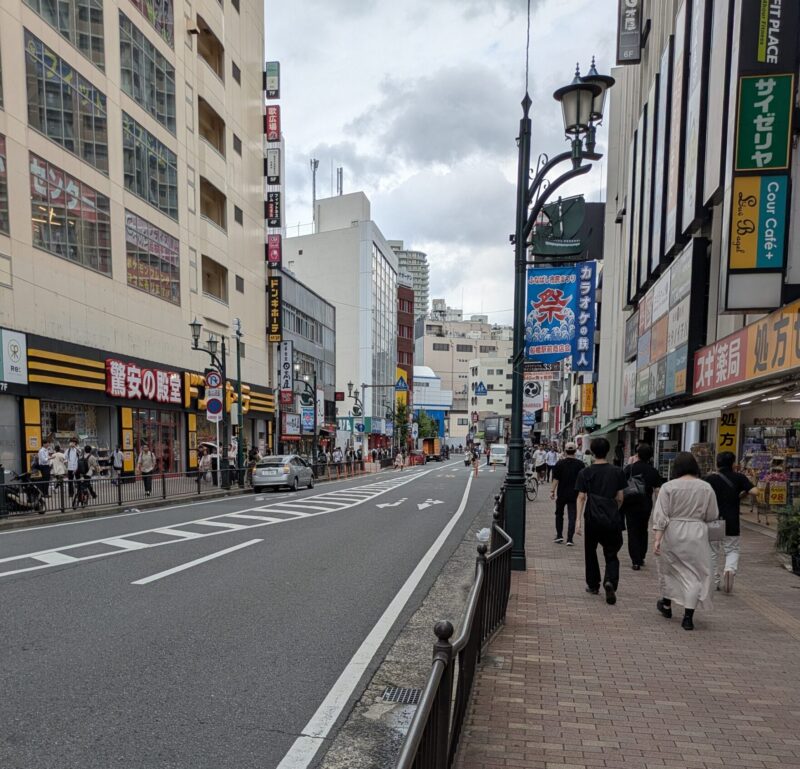 上の画像は駅前通りを船橋駅方向に向かって移したものですが、この画像を見るかぎりでも、「安売りの殿堂・ドン・キホーテ」、ドラックストア、ラーメン店、銀行など両サイドにびっしりと商業施設が立ち並んでいます。