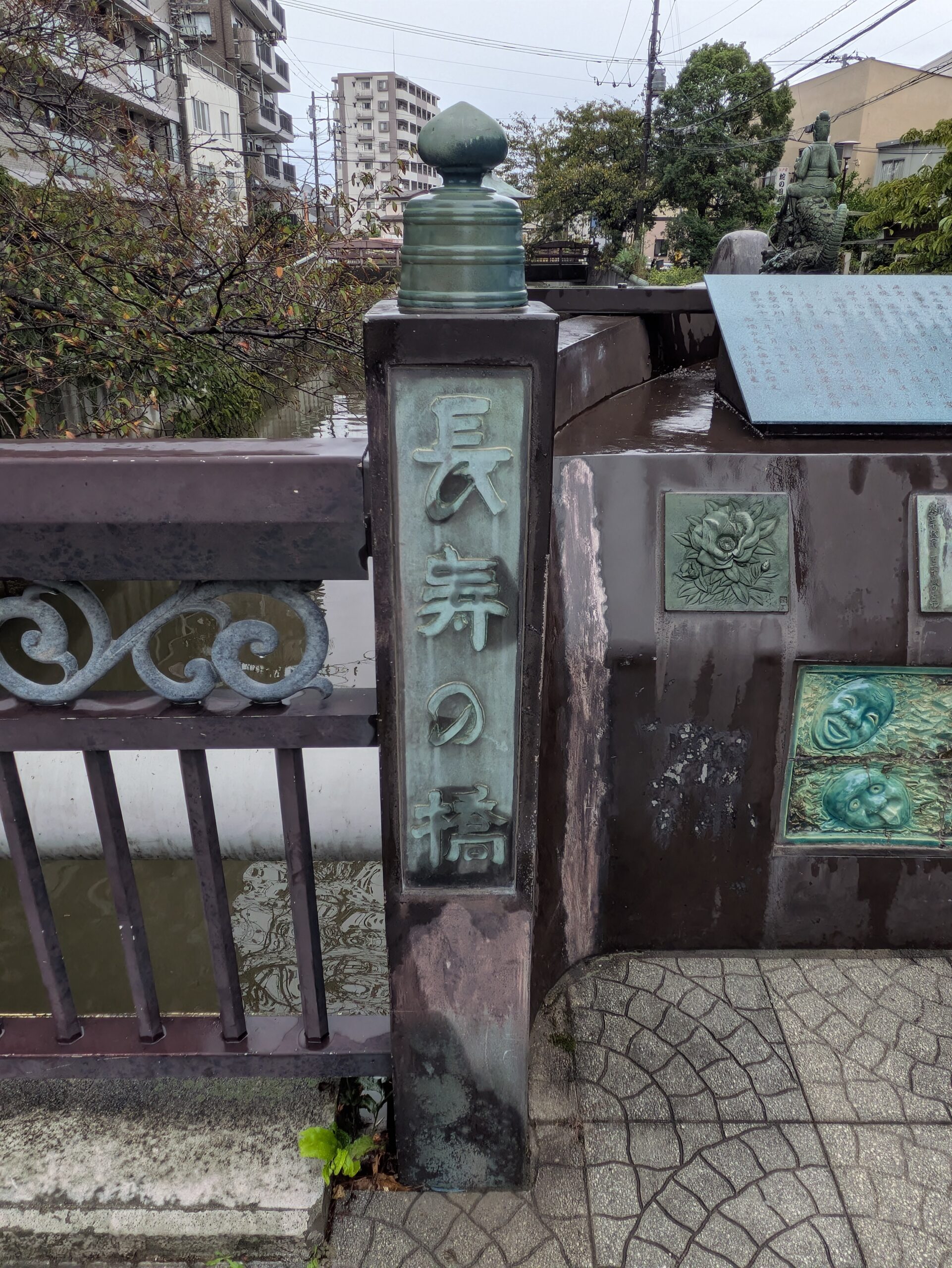 お寺・神社巡りを一通り楽しんで本町通りに戻ると船橋市を流れる一級河川「海老川」にかかる「長寿の橋」を渡ります。出来たらこの橋にも注目してよく観察していただきたいです。