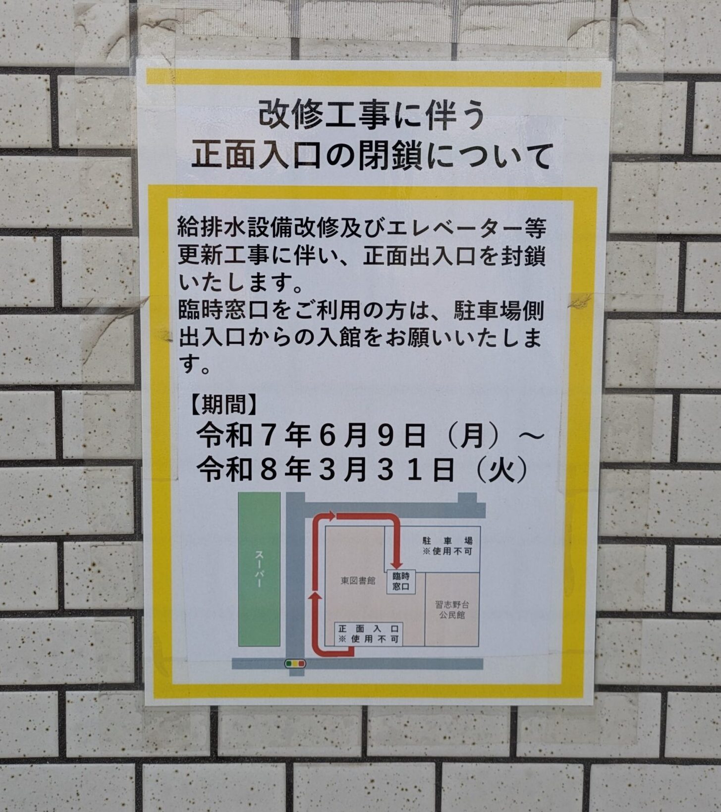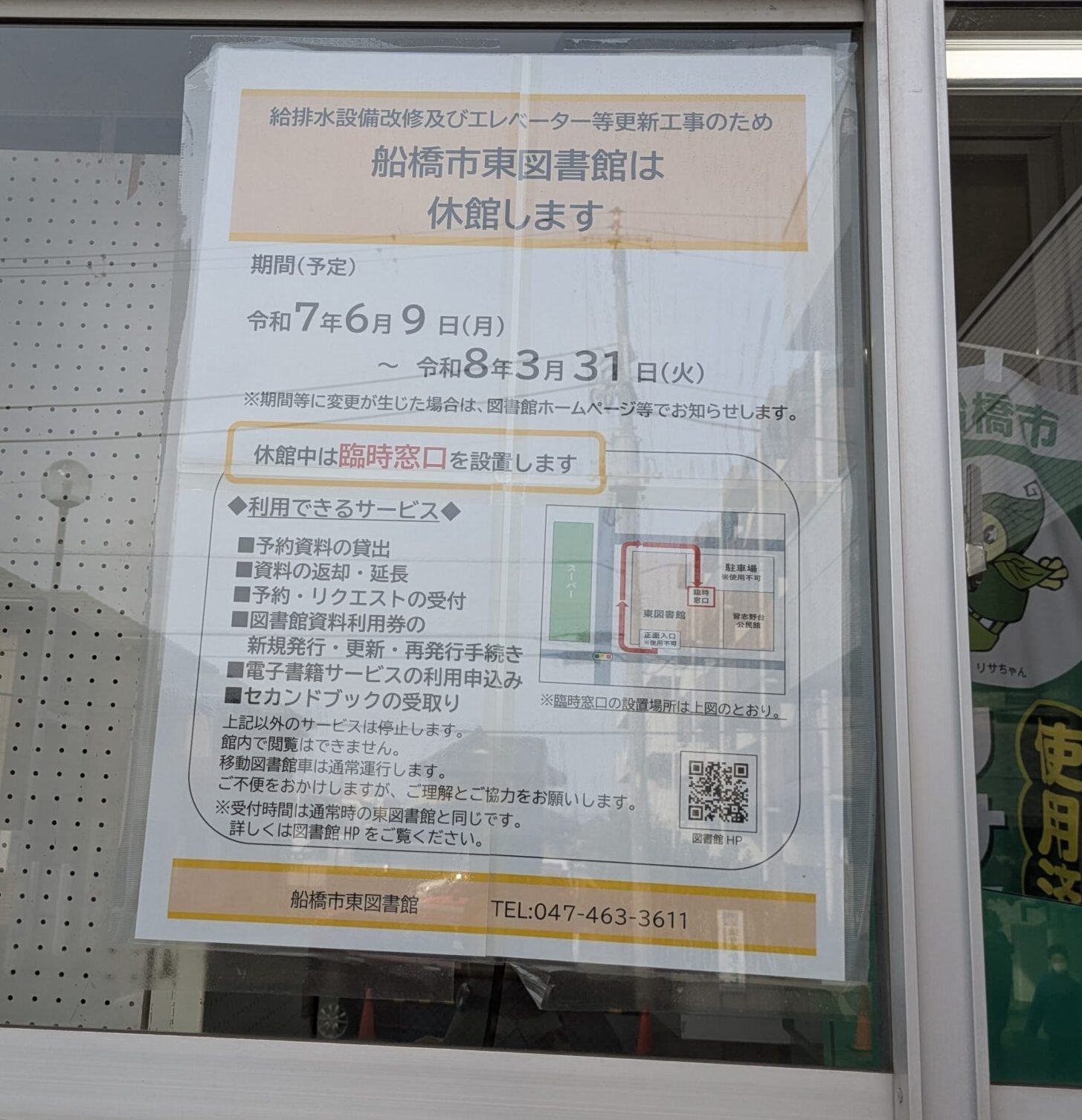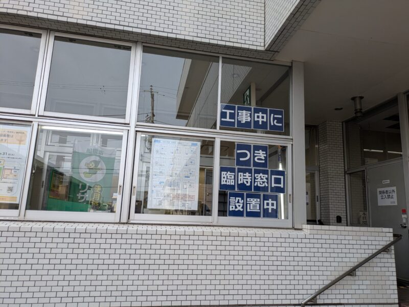 正面玄関にこのような表示がありました。改装工事で「休館」となっていて休館期間は令和8年3月31日までだそうです。休館期間中に利用者の方が困らないように「臨時窓口」を設置するとのことです。